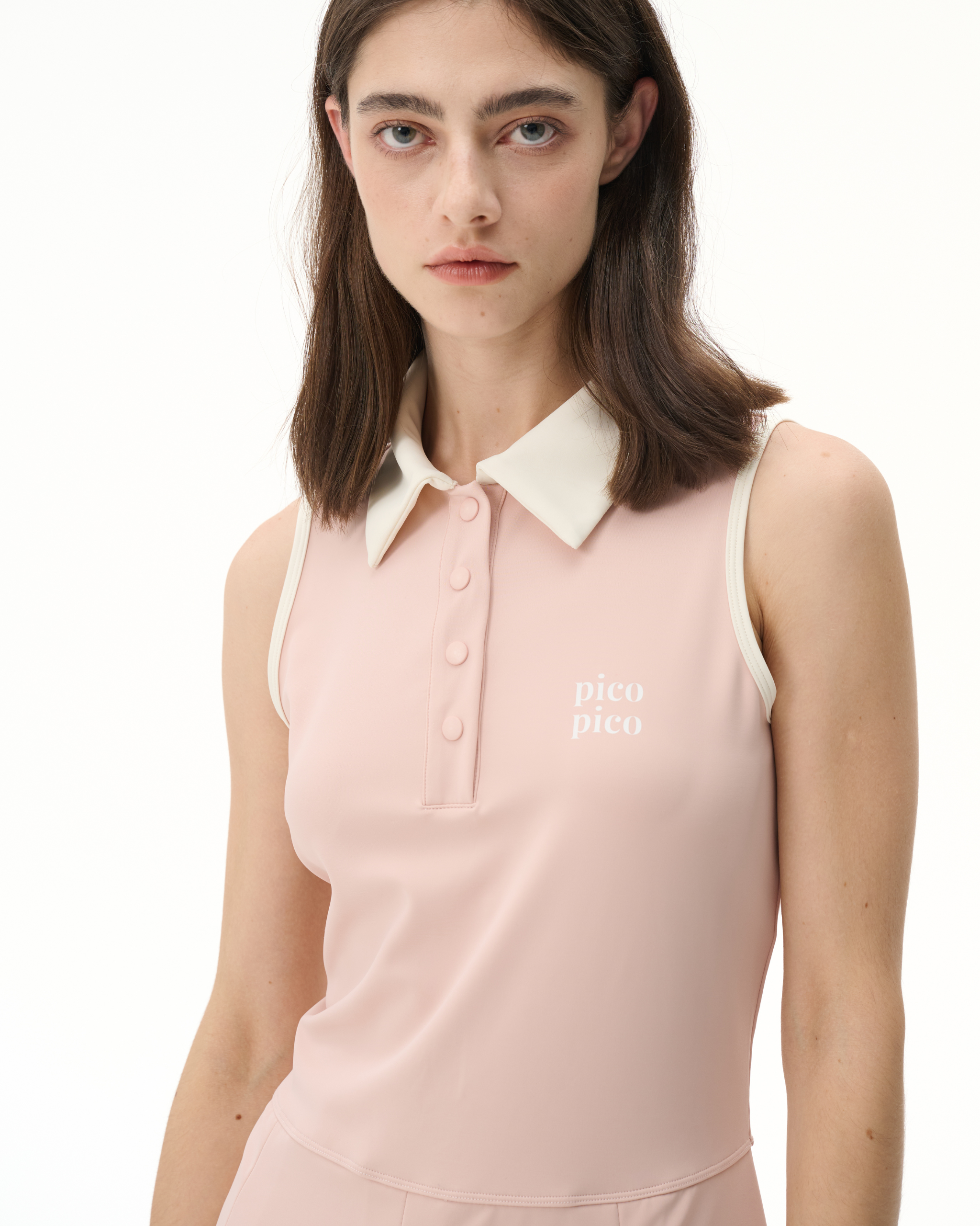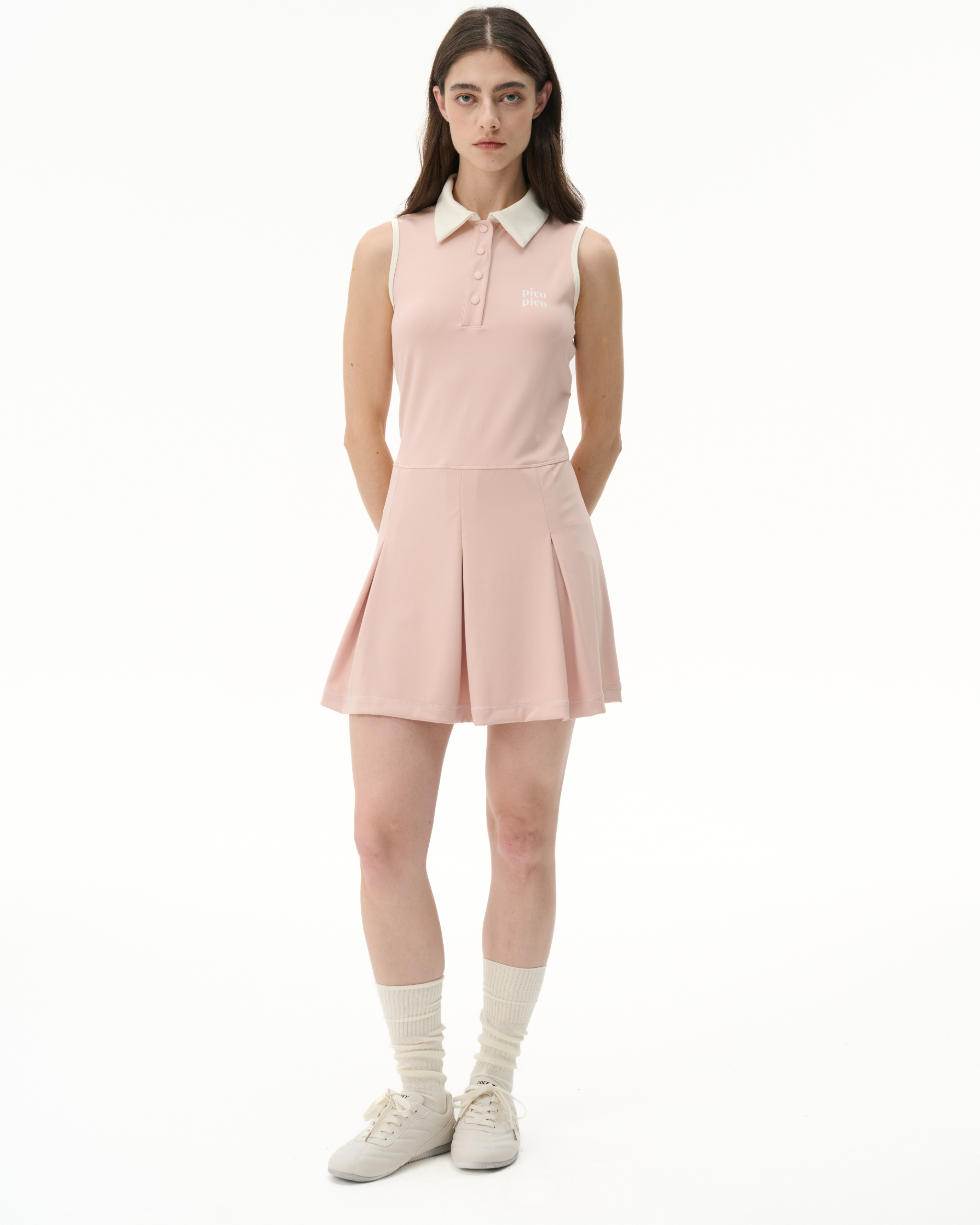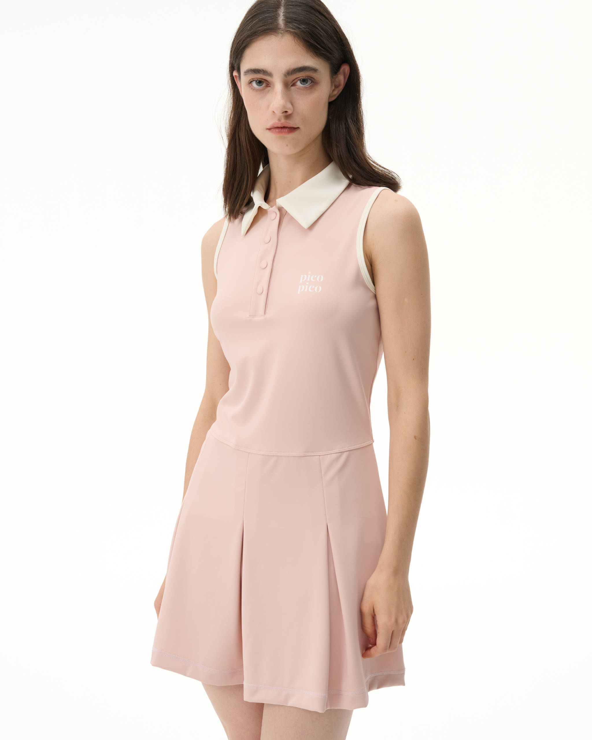 The Tomo Dress gives the polo dress a playful update with its slim, babydoll-inspired silhouette and low-waist design. A contrast collar, armhole binding, button-up front, and chest logo add vintage-sport detail, while detachable shorts provide coverage for play and versatility for daily wear. Designed to be worn with your favorite sports bra for added support.